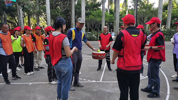 擊鼓顛球又叫動感顛球、鼓動心聲、鼓動人心。這是一個要求團隊高度協作的項目,需要大家在短時間內不斷練習,使每個人在過程中協調一致。