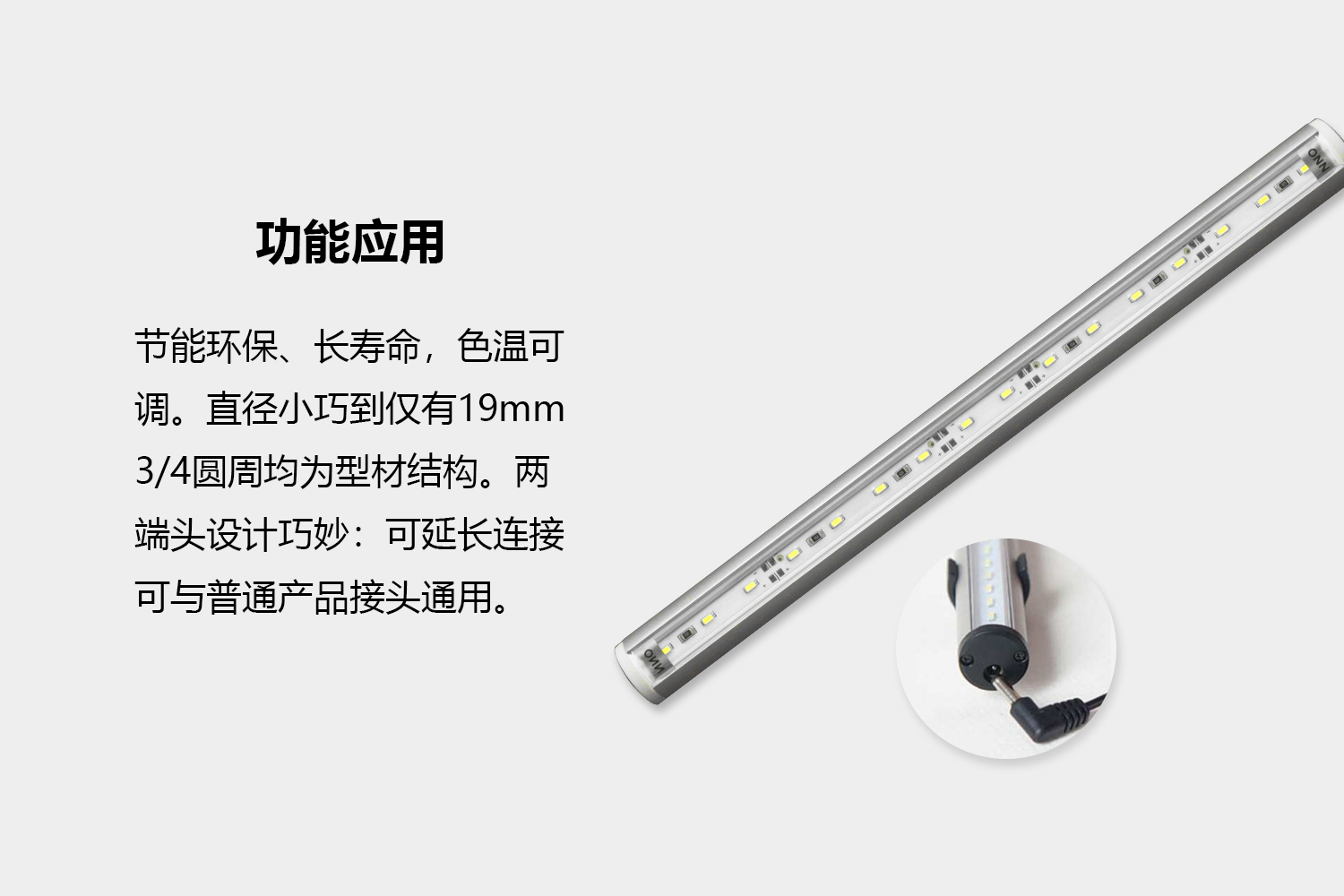兩端頭設計巧妙,且燈管可并接,連接頭薄,燈與燈之間可以達到無形效果;