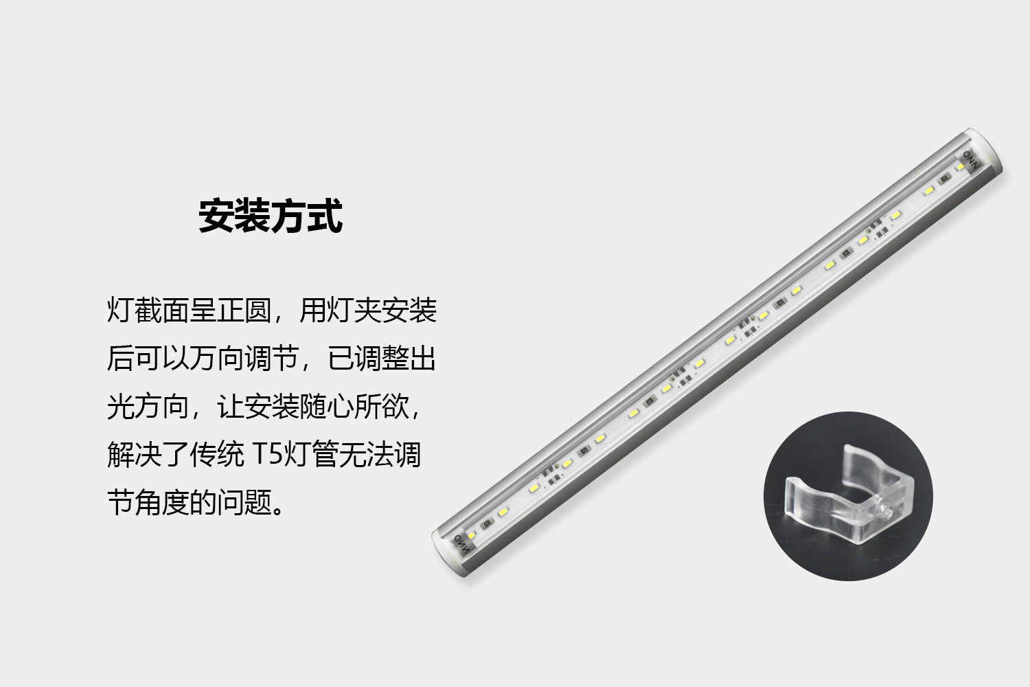此燈截面呈正員,用燈夾安裝后可以萬向調節,以調整出光方向,完全解決了傳統T5燈管無法調節角度的問題。