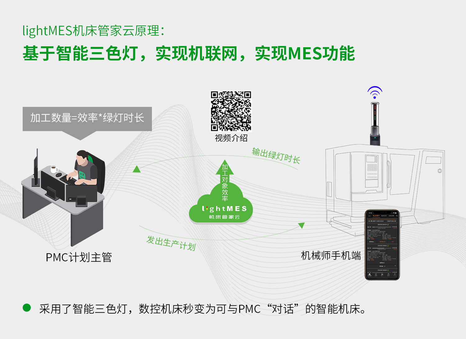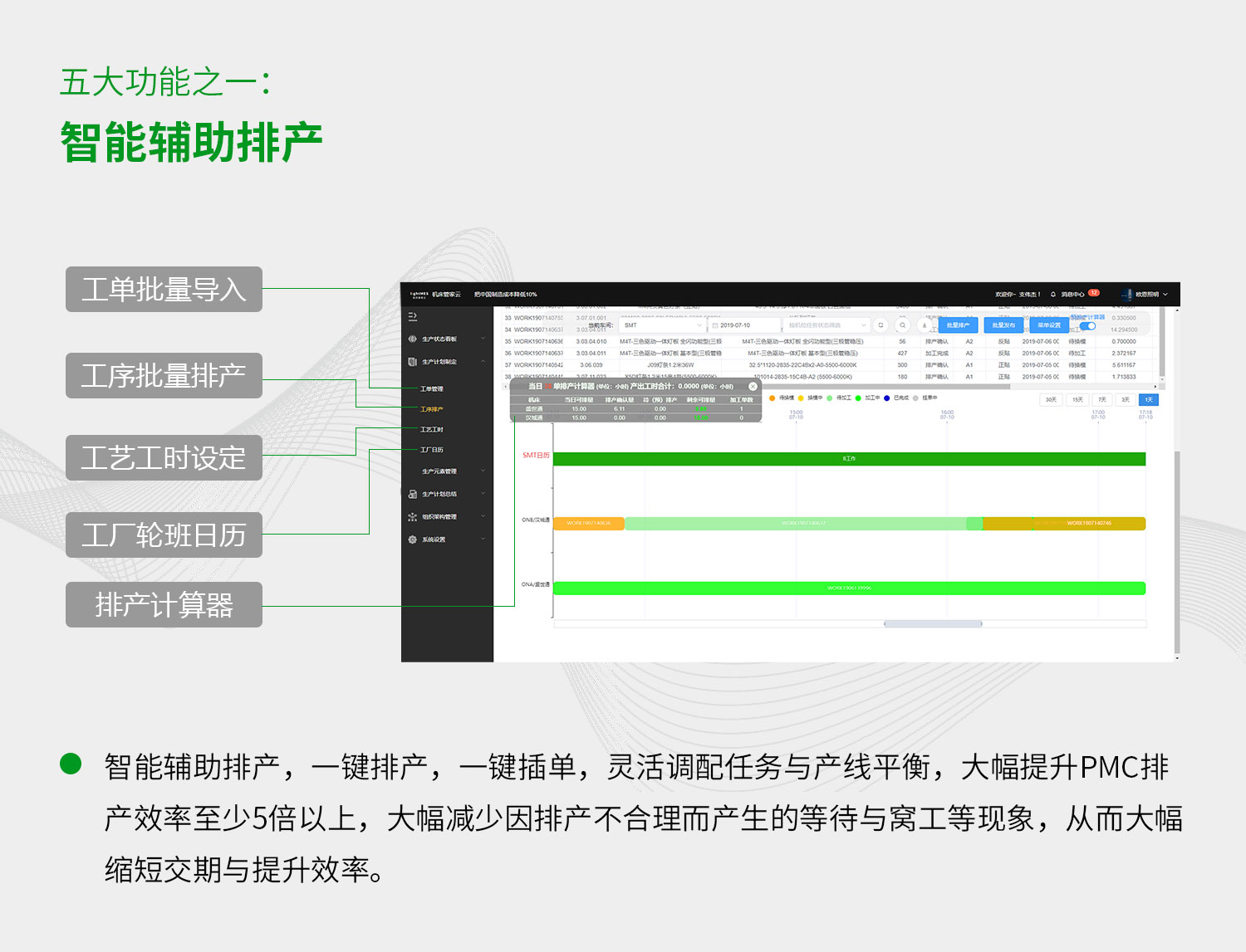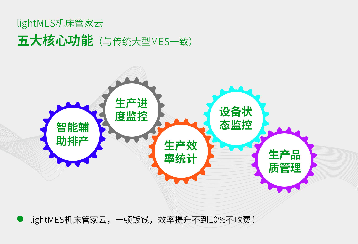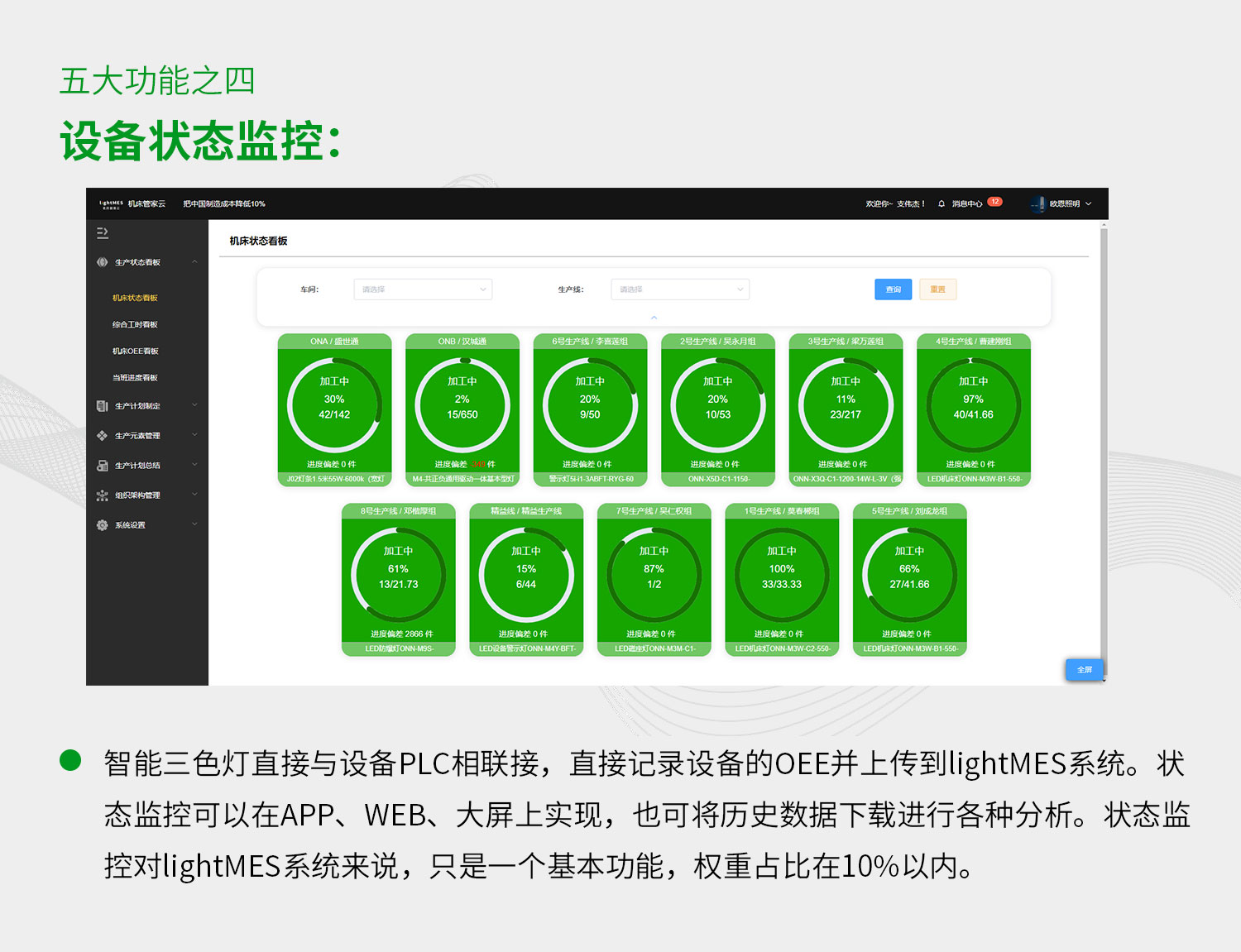 lightMES機床管家云五大功能:智能輔助排產、生產進度監控、生產效率統計、設備狀態監控、生產品質管理。