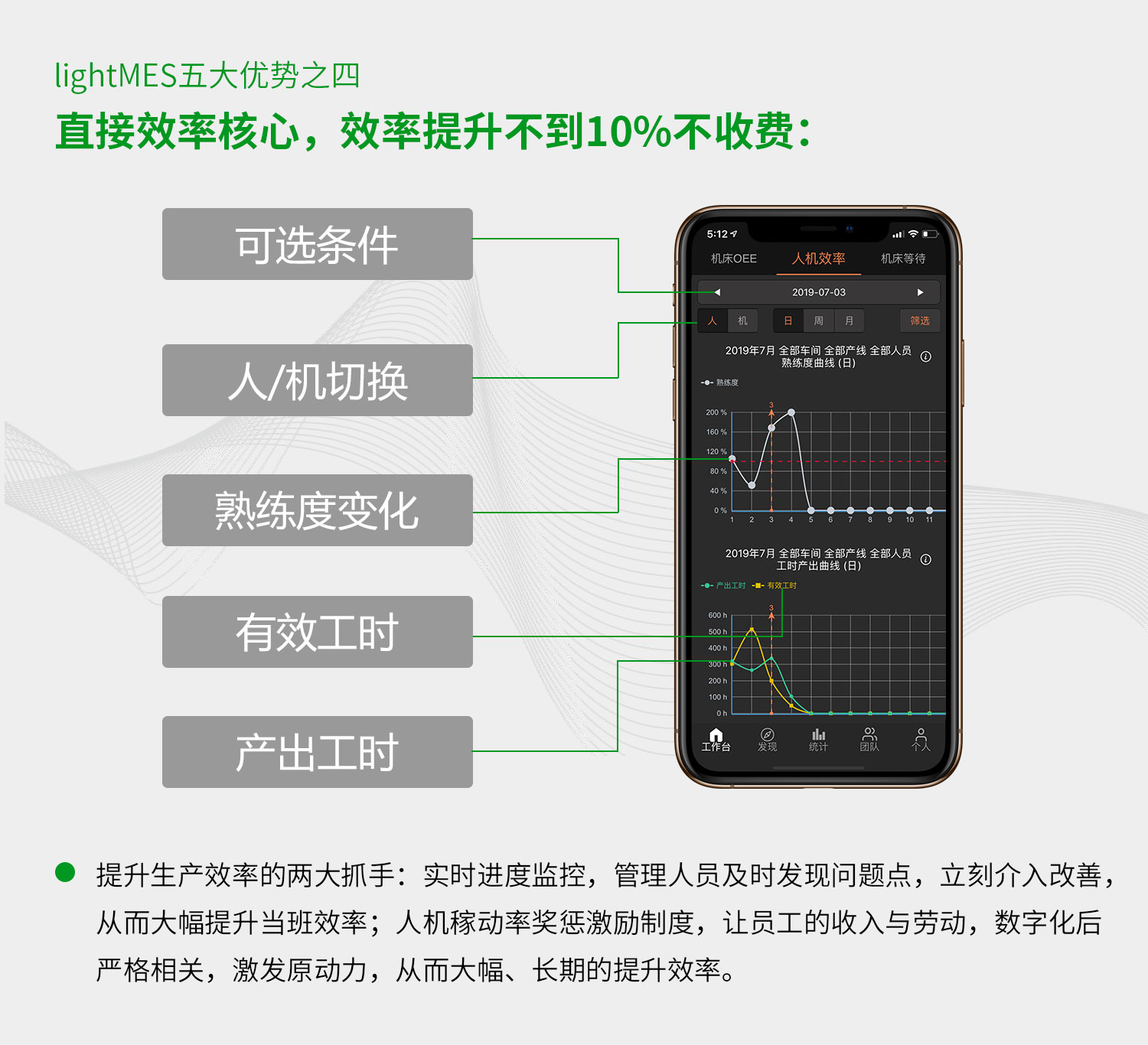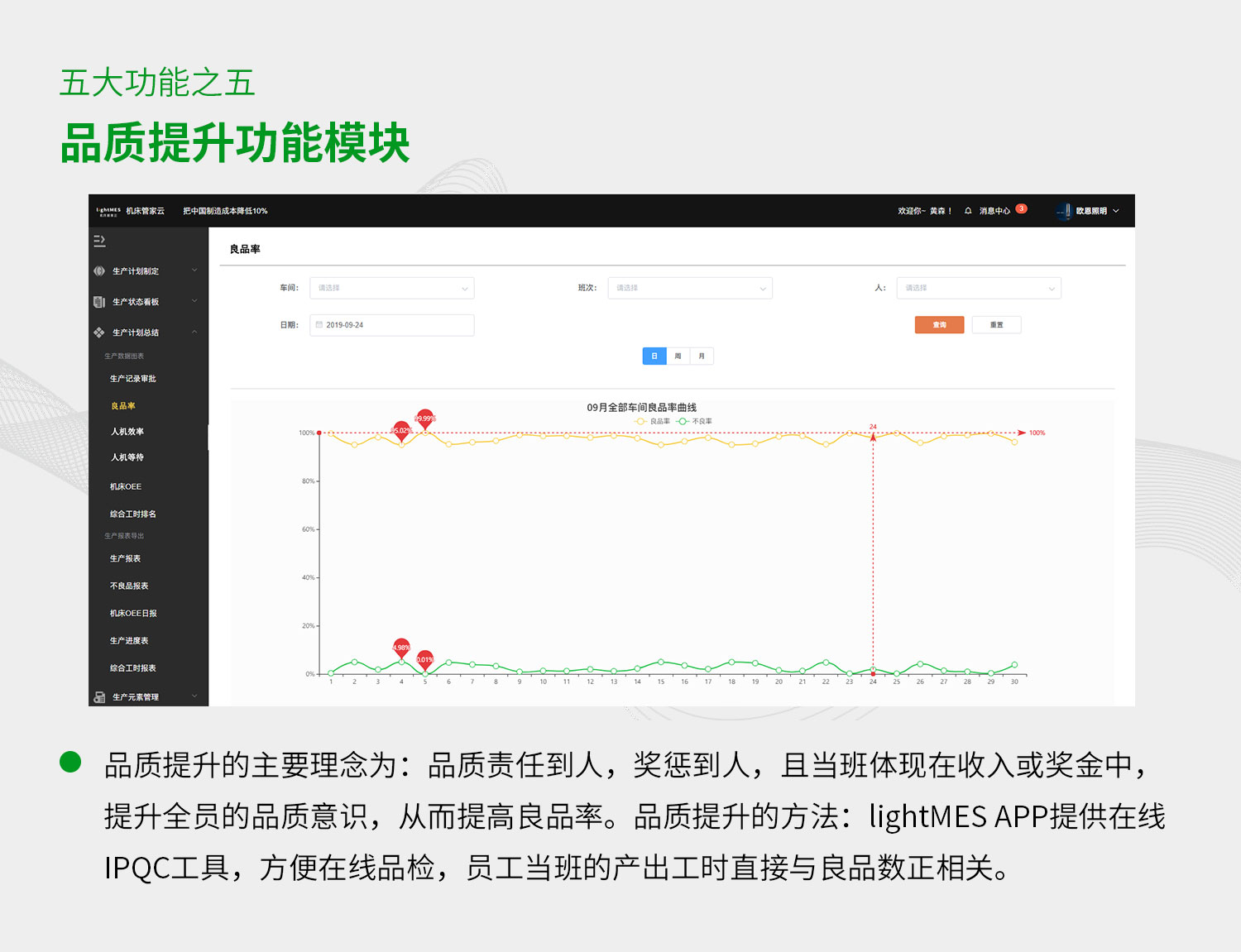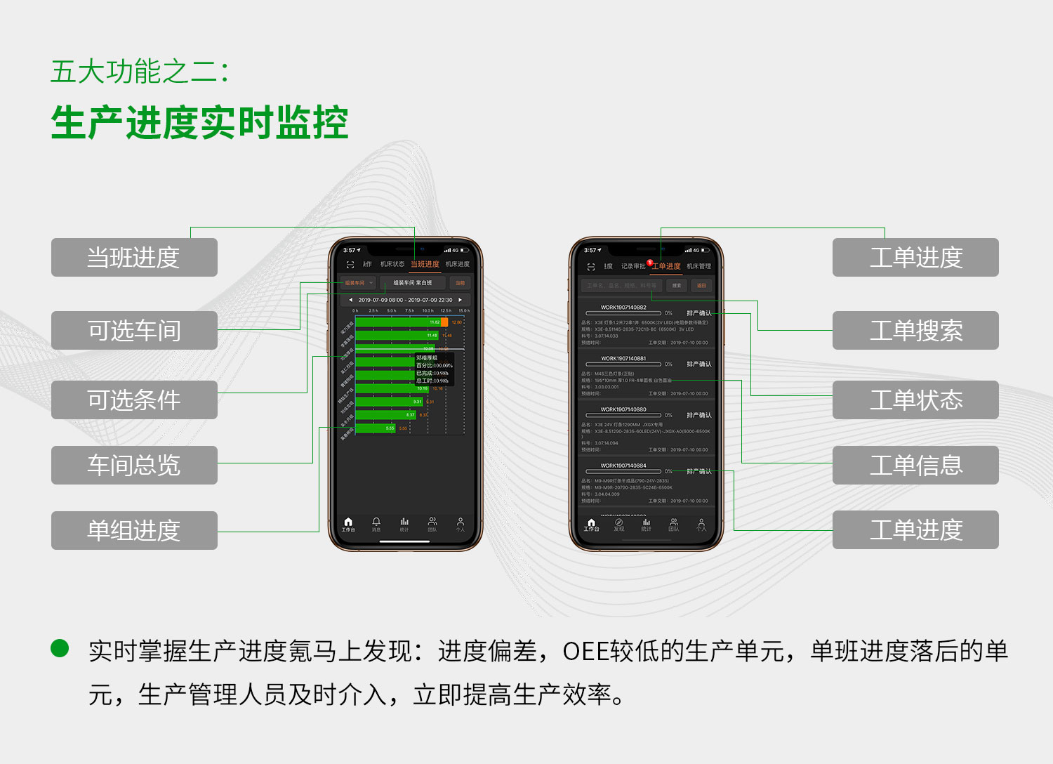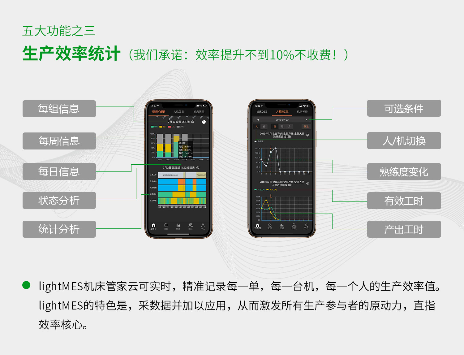 lightMES機床管家云五大功能:智能輔助排產、生產進度監控、生產效率統計、設備狀態監控、生產品質管理。
