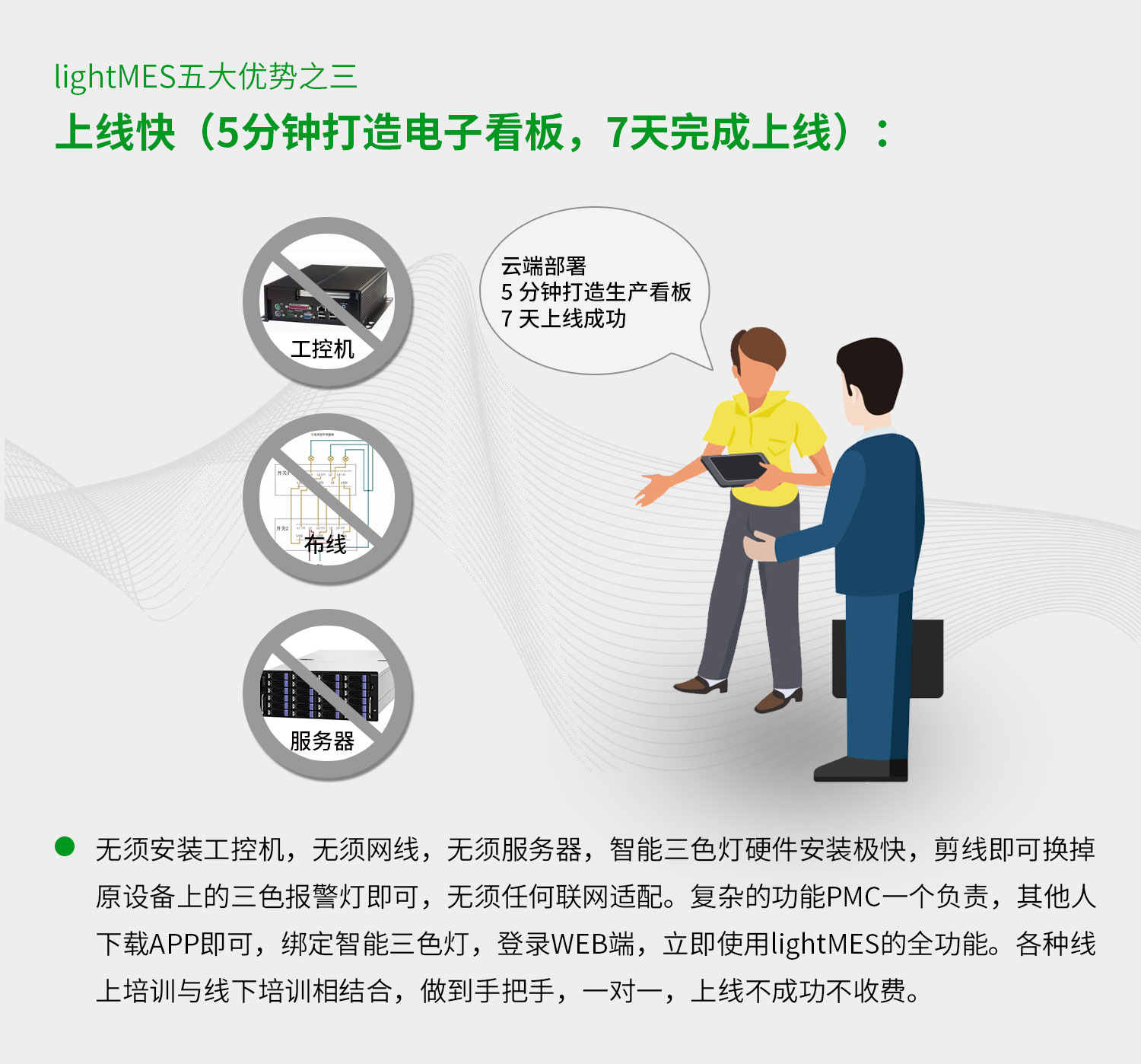 機床管家云MES管理系統優勢,上線快,5分鐘打造電子看板,7天完成上線。